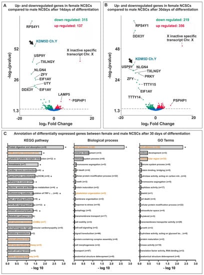 (A,B) Ribosomal Protein S4 Y-Linked 1 (RPS4Y1) and KDM5D (depicted in cyan, arrows) were most significantly downregulated in female NCSCs after 14 days and 30 of differentiation compared their male counterparts. (C) Differentially expressed genes between male and female NCSCs belonged, among others, to the osteogenic-related KEGG pathways and GO terms (depicted in orange). * padj < 0.05 was considered significant.