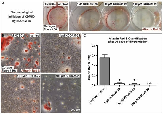 Pharmacological inhibition of KDM5D significantly reduced the capability of male NCSCs to undergo osteogenic differentiation. (A,B) Exposure of male NCSCs to increasing concentrations (1 µM–100 µM) of KDOAM-25 resulted in a significant reduction in calcium deposition after 30 days of differentiation compared to untreated control. (C) Quantification of Alizarin Red S confirmed the significant inhibition of male osteogenic differentiation upon inhibition of KDM5D by KDOAM-25-treatment. Mann–Whitney test, * p < 0.05 was considered significant. n.d.: not detectable.