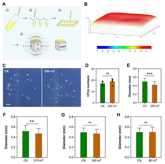 SMF treatment inhibits bacterial growth. (A) A diagram to show experimental procedure. Five milliliters bacteria cultured overnight were diluted step by step, and the dilution was spread on the surface of the medium. The petri dish was put on a magnet or a cubic iron as a control at 37 °C. (B) Magnetic field distribution of the E. coli growth plane, 10 mm above the NdFeB magnet. (C) Phenotype of colonies treated with (250 mT) or without (CK) SMF. (D) Effect of SMF on the number of CFUs. (E–H) Effect of SMF on the diameter of CFUs. Data shown as mean ± SD. n > 50. Statistical analysis was performed by t-test. ns p > 0.05, ** p < 0.01, *** p < 0.001.