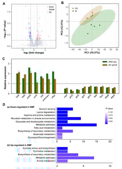 3.2. Transcriptomic Profiling Reveals That SMF-Regulated DEGs Are Enriched Mainly in Metabolism of Carbon Source Utilization and Stress Response