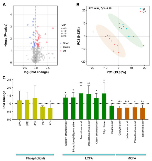 Metabolomic analysis of 250 mT SMF effects on E. coli metabolites. (A) Volcano map of the identified metabolites. Upregulated and downregulated metabolites with significant difference between SMF-treated and -untreated groups are shown as red and blue dots. Metabolites with no significant change are shown as gray dots. The size of dot represents the variable importance in projection (VIP). (B) PLS-DA score plots of the samples using metabolome data from ten independent biological replicates. (C) Effect of SMF on contents of phospholipids, LCFA and MCFA. Data shown as mean ± SD. Ten independent biological repeats were analyzed. Statistical analysis was performed by t-test. * p < 0.05, ** p < 0.01, *** p < 0.001.