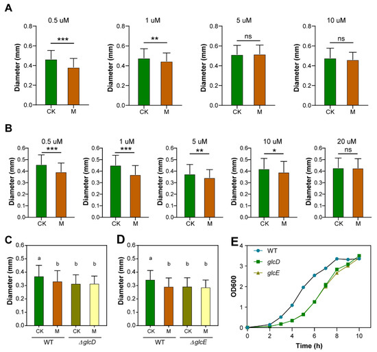 Effect of glycolate oxidase on SMF-inhibited E. coli growth. (A) Colony diameter of E. coli cultured on solid LB medium with various glyoxylate levels. (B) Colony diameter of E. coli cultured on solid LB medium with various glycolate levels. (C) Effect of glcD mutations on colony diameter of E. coli. (D) Effect of glcE mutations on colony diameter of E. coli. (E) Growth curves of E. coli TOP10 strain (WT) and glcD, glcE mutant strains under GMF condition. Data shown as mean ± SD. n > 50. Statistical analysis was performed by t-test. ns p > 0.05, * p < 0.05, ** p < 0.01, *** p < 0.001. Lowercase letters on the top of bar plots in (C,D) indicate significantly different groups as determined by one-way ANOVA with post-hoc Tukey HSD testing (p < 0.001).