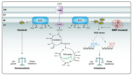 To date, the radical pair mechanism has been well recognized and widely testified as a good model to explain a variety of SMF bioeffects [25,26,27]. Free radicals, such as ROS and reactive nitrogen species, are inevitably produced from redox reactions in organisms. SMF can increase the lifetime and concentration of radical pairs [26]. Such effects are more pronounced when the radicals are generated in some physical boundary, such as micelles and bilayer membranes, due to their crowding together [25]. Recent studies showed that LCFA utilization generates higher levels of ROS due to the lack of the antioxidant ubiquinone, a lipid-soluble electron carrier in the electron transport chain (ETC), compared to glucose, succinate or acetate carbon source [73]. This is because a large number of reduced cofactors, including NADH and FADH2, are generated in LCFA degradation, thus conferring redox stress and electron leakage that occurred in the inner membrane of E. coli. In this study, we found that LCFA utilization was inhibited to a certain degree, and the expression of some genes involved in defense against redox stress were coordinately altered under moderate-intensity SMF. Thus, when E. coli is subjected to SMF, LCFA-induced ROS accumulate in the inner membrane of E. coli and trigger a bacterial response to ROS stress.
