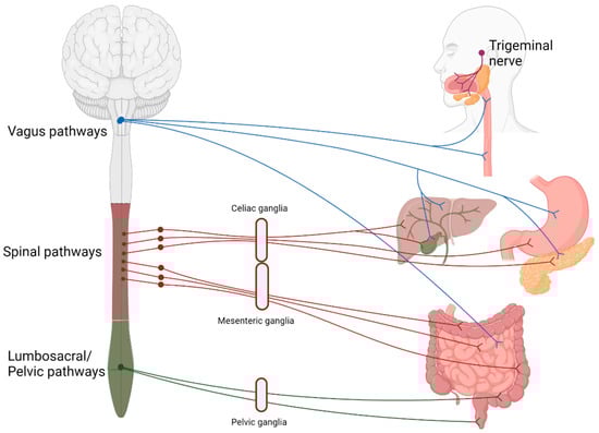 Schematic representation of the extrinsic innervation of the digestive system. Sympathetic innervation is performed mainly by spinal nerves (red), while parasympathetic by the vagal (blue) and pelvic branches (green). Both the spinal and vagal pathways are also involved in sensory and motor innervation. The trigeminal branches (purple) serve primarily sensory and motor functions.