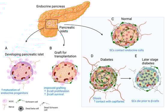 Role of SC and neural crest (NC) cells in the physiology and disease of the endocrine pancreas. (A) Reciprocal signalling with endocrine progenitors promotes islet maturation and glial fate choice by NC cells. (B) The transplanted islets contain surviving donor SCs. Co-transplantation and coating of endocrine islets with NC stem cell (NCSC)-like cells improve graft function and stimulate β-cell proliferation and survival. (C) SCs cover the surface of endocrine islets in mice (to a lesser extent in humans) and make contact with endocrine cells. (D) In T2D and insulitis, SCs expand and gliosis is observed. Extensive contacts are detected with capillaries. (E) With the onset of T1D SCs die before β-cells and innervation is reduced. SCs might have immunomodulatory function.