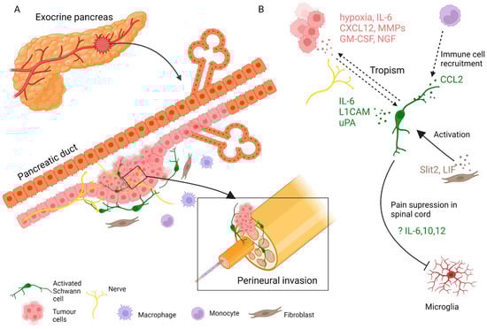 SC involvement in the pathophysiology of pancreatic cancer. (A) SCs, fibroblasts, immune cells, and other cells of the stroma contribute to the progression of pancreatic tumours and nerve invasion. (B) SCs engage in paracrine interaction with tumour and stromal cells.