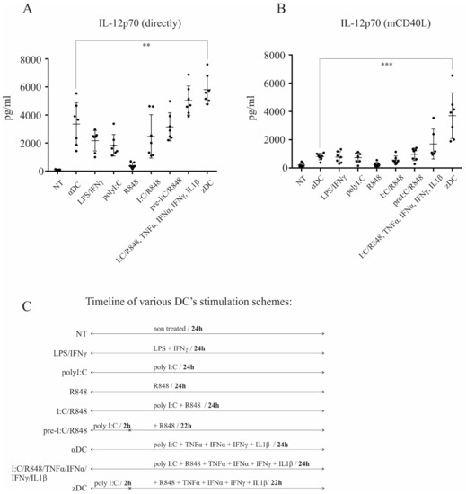 zDCs possess extensive capacity for IL-12p70 production upon CD40-ligand stimulation. Dendritic cells were generated from peripheral blood monocytes, as described in the Materials and Methods. (A) The production of IL-12p70 was measured directly from culture supernatants, after 24 h stimulation of DCs using various maturation protocols, as depicted in the figure. (B) IL-12p70 was measured from co-cultures after DCs were activated, extensively washed, and re-stimulated via CD40-CD40L pathway. Data represent mean ± SD of seven independent experiments. The black dots represent individual sample values. Statistical significance for comparison of zDC vs. αDC samples was performed using Student’s unpaired t test. A p value of less than 0.05 was considered statistically significant. (** p < 0.01; *** p < 0.001). (C) A timeline of various DC’s maturation schemes.