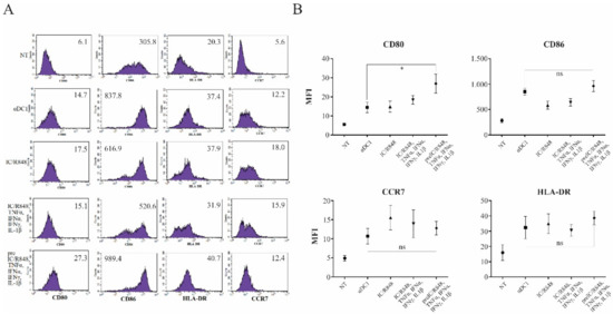 zDCs display optimally matured phenotype. (A,B) Dendritic cells were differentiated from monocytes isolated from freshly prepared human buffy coats, as described in the Materials and Methods. They were then either left untreated (NT, immature DCs) or stimulated for 24 h using different maturation protocols, focusing on various combinations of TLR3 and TLR8 agonists and inflammatory cytokines. After maturation, DCs were analyzed for the surface expression of CD80, CD86, CCR7, and HLA class II molecules. Numbers in histograms represent the mean fluorescence intensity values. Shown is one representative out of four independent experiments performed. Data were analyzed on a FACSCalibur system using CellQuest software version 3.3 (BD biosciences). Statistical significance between individual pairs was analyzed using Student’s unpaired t-test (ns—non significant; *—p < 0.05).