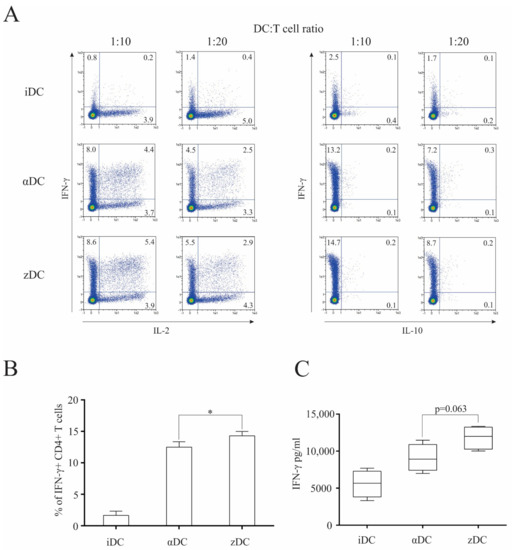 Subsequently, we wanted to assess the functional capacity of zDCs to induce T cell polarization. For this purpose, we cultured immature DCs, αDCs, or zDCs with isolated naïve CD4+CD45RA+ T cells, as described in the Materials and Methods section. Co-cultures were performed in 48-well tissue culture plates. In all cases, RPMI supplemented with 10% human AB serum was used as the culture medium. After 7 days, intracellular cytokine secretion of IL-2, IL-10, and IFN-γ was determined in stimulated T cells, as described in the Materials and Methods section (Figure 4A). While we detected a low percentage of IFN-γ+ T cell populations from co-cultures with immature DCs, as expected, both αDCs and zDCs substantially increased the percentage of IFN-γ+ T cells. We observed a general trend for an increased ability of zDCs in comparison αDCs to induce IFN-γ+ T cell populations; however, although statistically significant (p = 0.0477), the change was not extensive (Figure 4B). For comparison purposes, we also analyzed the capacity of differentially stimulated T cells to secrete IFN-γ, by determining its levels in culture supernatants. After 7 days, T cells from the equivalent co-cultures as before were washed extensively, re-seeded, and stimulated with anti-CD2/CD3/CD28 macrobeads for 24 h. Afterwards, IFN-γ in the supernatants was determined, as shown in Figure 4C. In this case, we also observed increased IFN-γ values secreted by T cells stimulated with zDCs; however, the p value calculated from the four independent experiments did not demonstrate significance (p = 0.063).