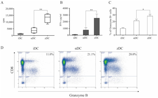 zDCs have an exceptional capacity to induce cytotoxic T cell responses. (A) iDCs, αDCs, or zDCs were used in co-cultures with whole, allogeneic CD8+ T cells. They were placed in 96-well tissue plates, with a 1:10 DC:T cell ratio. On day 4, the wells were pulsed with 1 μCi/well of 3H-thymidine. On day 5, cell proliferation was measured using liquid scintillation counting. Results show mean ± SD of four independent experiments (cpm, counts per minute). (B) In parallel co-cultures with allogeneic CD8+ T cells and variously treated DCs, after 5 days, levels of IFN-γ were analyzed in culture supernatants. Bar graphs represent mean ± SD of four independent experiments. Statistical comparison between individual samples was performed using Student’s t test. A p value of less than 0.05 was considered statistically significant (**—p < 0.01). (C,D) Cytotoxic T cell activation was measured by detection of intracellular granzyme B expression. iDCs, αDCs, or zDCs were used as stimulators of allogeneic CD8+ T cells. The co-cultures were performed in 48-well tissue plates in complete RPMI medium (10% human AB serum). After 5 days, the T cells were collected, washed, and stained for CD8 and granzyme B expression (intracellularly). Statistical comparison of individual pairs of three independent experiments was performed using Student’s t test (* p < 0.05). The numbers in upper right quadrants represent the percentage of granzyme B-positive CD8+ T cells.