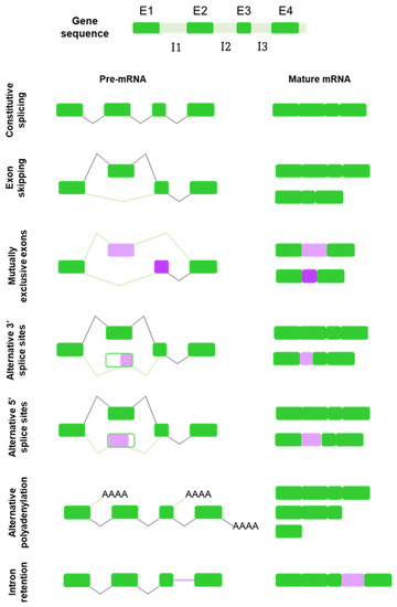 Schematic representation and summary of the mechanisms of alternative splicing. Pre-mRNA from a hypothetical gene is displayed with 4 exons (E1–E4, green) and 3 introns (I1–I3, light orange). Below, schematic representations of the different mechanisms of alternative splicing is evidenced as different potential alternative splicing decisions marked with purple branches as opposed to black branches for constitutive splicing decisions. RNA and protein fragments marked in violet and purple (mutually exclusive exons and alternative 3′ and 5′ splicing sites) show the differences with respect to constitutive splicing. “AAAA” (alternative polyadenylation) represents a polyadenylated sequence. RNA and protein fragments marked in light orange (intron retention) point out intronic regions that are maintained instead of spliced out, while the black dashed line represents the constitutive splicing decision that would happen if intron retention did not take place.