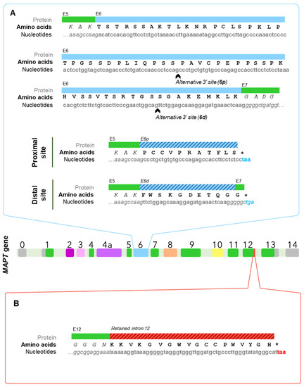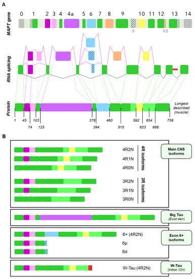 Very recently, the landscape of MAPT splicing variants has become even more complex, with the discovery of novel Tau isoforms generated by intron 12 retention and the consequent translation of a fragment of that intronic region [37] (Figure 2B).