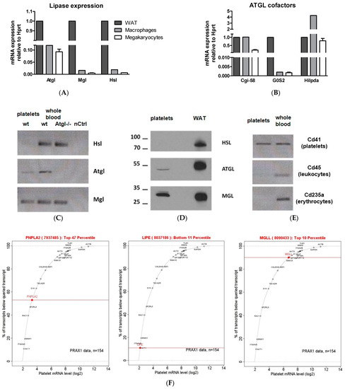 Neutral lipases are expressed in mouse and human platelets. mRNA expression of (A) adipose triglyceride lipase (Atgl), monoglyceride lipase (Mgl), hormone-sensitive lipase (Hsl), and (B) ATGL cofactors in megakaryocytes (n = 6) relative to the expression of hypoxanthine phosphoribosyltransferase 1 (Hprt) as a housekeeping gene. (C) RT-PCR of neutral lipases in purified platelets (lane 1). Whole blood RNA from wt (lane 2) and Atgl−/− mice (lane 3) as well as ddH2O (lane 4) were used as controls. (D) Lysates of platelets (pooled from 6 wt mice) were separated by SDS-Page and analyzed for HSL, ATGL, and MGL protein expression (lane 1) by Western blotting. Protein lysate of white adipose tissue (WAT) from a wt mouse was used as a positive control. (E) To confirm platelet purity, platelet RNA was analyzed with primers specific for platelets (Cd41), leukocytes (Cd45), and erythrocytes (Cd235a). (F) Human platelet mRNA expression data from 154 healthy subjects determined by microarray (http://www.plateletomics.org/plateletomics/, accessed on 10 January 2022, Copyright © 2022–2013. Bray Laboratory, Thomas Jefferson University. Shaw Laboratory, Baylor College of Medicine) [32] revealed mRNA expression of human ATGL (PNPLA2), HSL (LIPE), and MGL (MGLL) relative to the expression of reference genes.