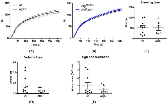 Unchanged hemostatic function in Atgl−/− mice. Platelet aggregation in (A) Atgl−/− and (B) platAtgl−/− blood was measured using a Multiplate® analyzer. Data are expressed as mean arbitrary units (AU) (n = 10). (C) Bleeding time, (D) blood volume loss, and (E) hemoglobin (Hgb) concentration as absorbance at 540 nm were determined in isolated blood of Atgl−/− mice. Data are shown as mean ± SEM (n = 6–10).