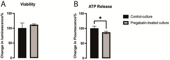 Demonstration of viability (A) and ATP release (B) in the pregabalin-treated and control cultures. Data are represented as mean ± SEM, n = 7 experiments. * p < 0.05.