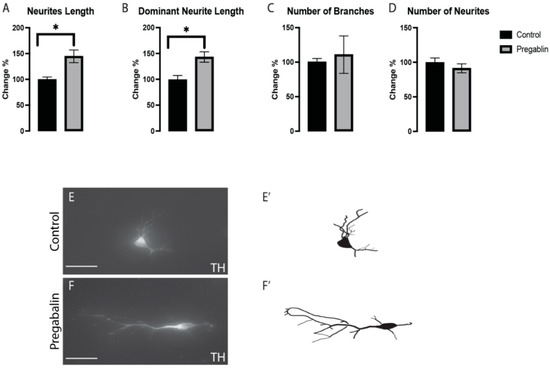 Pregabalin induced the elongation in TH+ vmDA neurons’ total neurite length (A) and dominant neurite length (B), but there was no significant effect on the number of branches (C) or neurites (D). Representative images and illustrations for vmDA neurons immunolabeled with TH in both groups; control (E,E’) and pregabalin-treated (F,F’) groups showed an increase in neurite elongation in response to pregabalin exposure. Scale bar: 50 μm. Data are represented as mean ± SEM, n = 4 experiments. * p < 0.05.