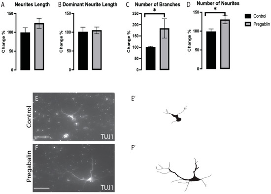 Pregabalin exposure did not affect the total neurite length (A) nor the dominant neurite length (B), while the number of branches (C) and neurites (D) were significantly increased in VM non-dopaminergic neurons (TUJ1+/TH−). Representative images and illustrations for VM neurons immunolabeled with TUJ1 in both groups; control (E,E’) and pregabalin-treated (F,F’) groups showed increases in the numbers of branches and neurites in response to pregabalin exposure. Scale bar: 50 μm. Data are represented as mean ± SEM, n = 4 experiments. * p < 0.05.