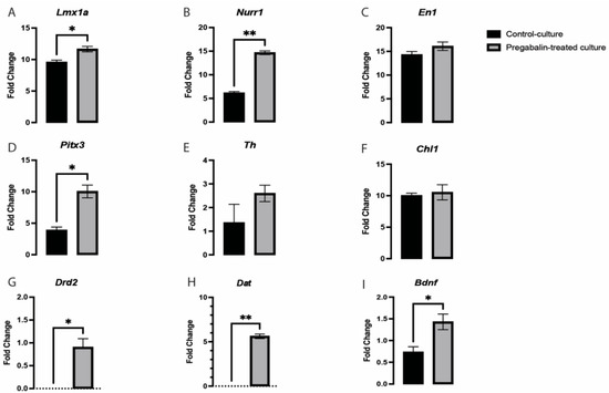 Pregabalin exposure caused a significant upregulation in the expression of Lmx1a (A), Nurr1 (B), Pitx3 (D), Drd2 (G), Dat (H), and Bdnf (I), but there was no significant change in the expression of En1 (C), Th (E), or Chl1 (F). Data are represented as mean ± SEM, n = 3 experiments. * p < 0.05, ** p < 0.01.
