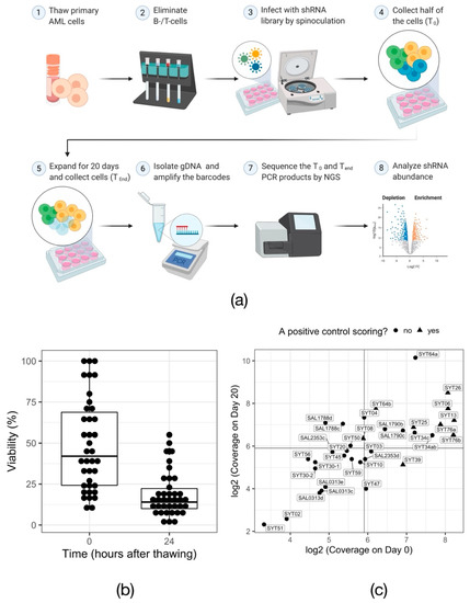 RNAi screen in primary AML samples. (a) Overview of the experimental procedure for RNAi-mediated in vitro screening of primary AML cells. Created with BioRender.com (b) Cell viability measured via trypan blue exclusion assay immediately after thawing of the samples (0 h) and after overnight cytokine induction (24 h). Each data point represents one primary AML sample. (c) Dot plot visualizing the shRNA representation, calculated based on the number of cells collected for gDNA isolation, in every primary sample at the beginning (Day 0) and the end (Day 20) of the screen. Solid lines mark the arbitrary threshold of 60× representation.