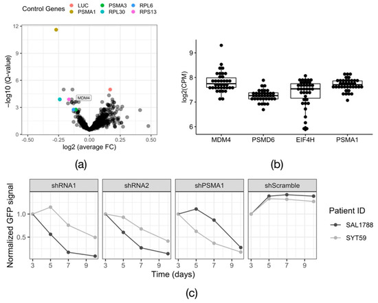 Unlike cancer cell lines, in vitro cultured primary cells are sensitive to manipulation procedures and have a limited proliferation capacity. Thus, functional screens in primary AML cells are a challenging task. Overall, 30 unique DNMT3AWT/R882X patient samples were screened. The total number of screened samples amounted to 39, considering replicate screens for some of the patient lines. From these, 34 samples, or 90%, survived the in vitro propagation, despite the initial drop of viability (Figure 2b, 42% median viability directly after thawing vs. 14% median viability 24 h after thawing; range at 24 h after thawing: 1–55%). In turn, 59% of these samples were proliferative in culture, i.e., the number of live cells increased between Day 0 and Day 20 of the screen (see Table S5 and Figure S2a). As expected for primary material, the achieved library coverage was highly variable across samples (Figure 2c; 56× median representation at T0, range 10× to 300×). Compared to cell viability and the proliferation rate in culture, library coverage appeared to have the biggest impact on the behavior of positive controls (Figure S2b), suggesting that the absolute number of shRNA-carrying viable cells is a major determinant of the screen success. Based on the performance of the shRNAs targeting the positive control genes PSMA1, PSMA3, RPS13, RPL6 and RPL30 compared to the non-targeting control shRNAs against luciferase (LUC), nine screens were considered successful. (Figure 2c and Figure S1).