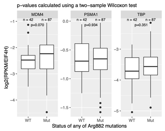 Comparison of MDM4 transcript expression in NK-AML samples with and without the DNMT3A R882H mutation. The expression values across samples are normalized to the housekeeping gene EIF4H. PSMA1 and PSMD6 are housekeeping controls. n is the number of samples in each group. The data was retrieved from the publicly available dataset GSE67040. RPKM—reads per kilobase of transcript per million of mapped reads.