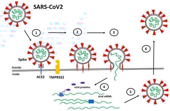 The binding of Spike to ACE2 positions Spike on the cell surface for cleavage occurs by human proteases, particularly transmembrane protease serine 2 (TMPRSS2), that induces a conformational change from a compact structure to an extended “fusion” structure that facilitates the fusion of the viral and host cell membranes, thereby allowing viral RNA to gain entry to the cellular cytoplasm where it can be translated and replicated to produce new viral particles (Figure 1). The ability of TMPRSS2 to induce the conversion of Spike into the fusion conformation is enhanced if Spike is first cleaved by the protease furin during biosynthesis [,,]. Thus, the expression and distribution of ACE2 determines the tissues that are infected by SARS-CoV2 and ultimately mediates COVID-19 pathogenesis. Interesting variations in ACE2 expression have been reported in individuals by age, gender, and disease, suggesting potential explanations for the highly variable clinical responses to SARS-CoV2 infection [,,].