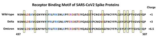 Amino Acid sequence of the Receptor Binding Motif of Spike Proteins. The sequences from position 437 to 507 are shown for the wild-type, and Delta and Omicron variants. The yellow shaded boxes indicate unique mutations in Omicron, the green box indicates a unique mutation in Delta, the pink box indicates a mutation shared by Delta and Omicron. Basic amino acids are colored blue and acidic amino acids red. The estimated charge for each RBM is indicated on the right (+0.5 was assigned to H505 in Omicron Spike).