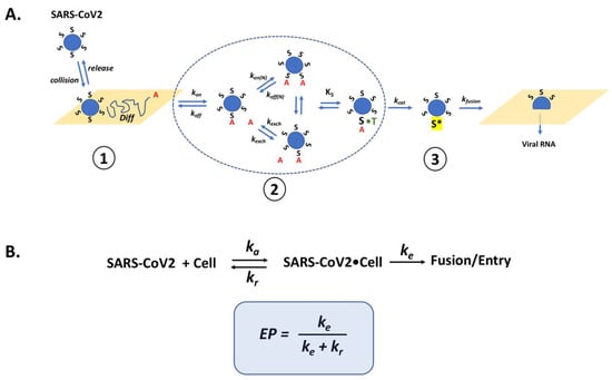 The first critical step in the process of SARS-CoV2 infection is the binding of Spike proteins to ACE2 on the surface of target host cells. This binding can, as a first approximation, be considered a classic receptor–ligand interaction, in which ACE2 is the receptor (A) and Spike is the ligand (S) and the interaction is defined by its association and dissociation rate constants and corresponding equilibrium dissociation constant (Equations (1) and (2)). As such, the “effectiveness” of Spike would be expected to be controlled by the number of ACE2 receptors on the surface of the target cell and the intrinsic affinity of the interaction. However, this simplification does not consider the multivalency of the virus particle, the movement and restriction of ACE2 within the two-dimensional plasma membrane nor the fact that the virus can be removed from the system after membrane fusion and/or endocytosis. A more complete treatment of the interaction should include the diffusion of the virus particle on the membrane surface after primary collision with the cell, rebinding of Spike to ACE2, generation of multiple Spike-ACE2 complexes on a single viral particle, and non-reversible Spike cleavage and cell entry steps. While a formal treatment of this complex interaction is beyond the scope of this review, the reader is directed to several elegant kinetic models of virus binding that have been developed [,,,]. In particular, the Brownian adhesive dynamics model developed by English and Hammer [], where viral attachment is dictated by a balance of thermal, hydrodynamic and adhesive forces, the lateral movement of receptors in the membrane, and the availability of viral attachment proteins, demonstrates how important it is to consider these additional aspects in predicting virus interactions with target cells. For example, allowing receptors to move freely within the membrane significantly reduced the dependence of virus attachment on receptor density, whereas the number of virus particles bound at steady-state was insensitive to increases in receptor binding on rate once it was greater than the rate of receptor diffusion.