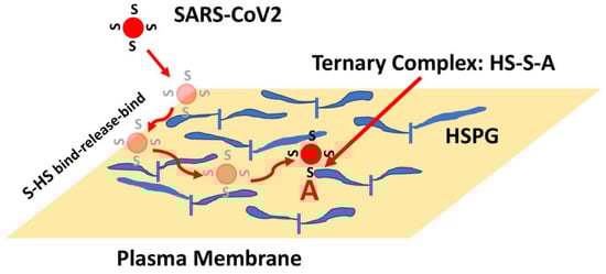 Considering the kinetic model described in Section 3, one might now consider the presence of HS, which generally presents protein-binding sites in the range of 106–107 per cell such that an initial collision of SARS-CoV2 with a cell might now be predicted to lead to hundreds to thousands of virus encounters with HS binding sites. Moreover, the binding of proteins to HS often show very fast kinetics such that proteins can bind, release, and rebind extensively, preventing their release from the cell surface [,]. This rapid binding mechanism provides a means for a protein, or a bound virus particle, to scan a large area of the cell surface to increase the chance of encountering and binding to lower density receptors. Thus, a SARS-CoV2 collision with the cell surface might be expected to result in Spike-HS interactions that ultimately facilitate the formation of stable HS-Spike-ACE2 complexes (Figure 5). Considering this HS co-receptor mechanism, the expression level and binding affinity of ACE2 on the cell surface might not be the key factors that limit SARS-CoV2 infection. Instead, the ability of Spike to interact with HS, or its susceptibility to proteolytic cleavage by TMPRSS2 might be the rate-determining factors.