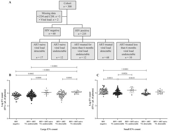 Flow chart of study participant categorization (A). Counts of purified large (B) and small (C) plasma EVs by flow cytometry using DID and CFSE staining. Study participants were HIV-negative, HIV-positive on antiretroviral therapy (ART) for more than six months, or HIV-positive and ART-naïve, with an undetectable or detectable viral load (VL). An ordinary one-way ANOVA corrected for multiple comparisons using the Tukey test was used to compare groups.