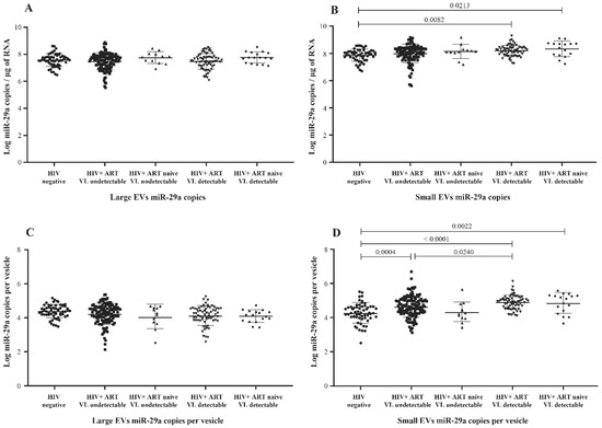 In previous studies using peripheral blood mononuclear cells, the concentration of miR-29a was found inversely correlated with viremia, and its overexpression has been associated with the inhibition of viral replication and thus appears to force HIV-1 into latency [23,24,30]. Comparing nonviremic HIV+ patients relative to the control (HIV-) participants, we found no significant difference in miR-29a expressed as copies per µg RNA or copies per large vesicle (Figure 2A,C). In contrast, miR-29a copies per µg RNA were increased significantly in small EVs of viremic patients compared to the control group (Figure 2B), as were copies per vesicle (Figure 2D). In addition, copies per vesicle were significantly increased in viremic compared to nonviremic ART-treated patients (Figure 2D). This latter comparison held properly over different levels of viremia (Figure S3D). These data show altogether that HIV-1 replication during ART induces the overexpression of miR-29a in small plasma EVs.