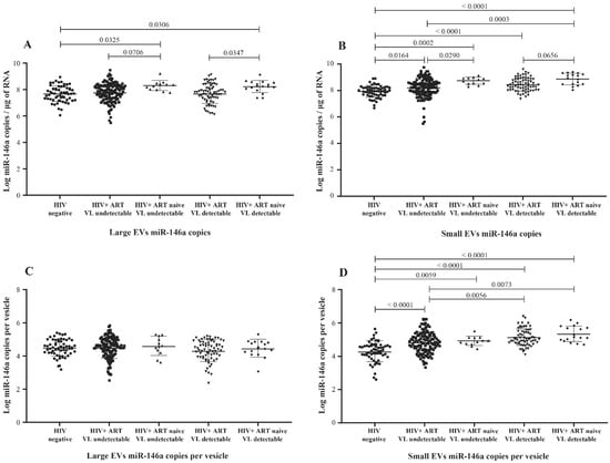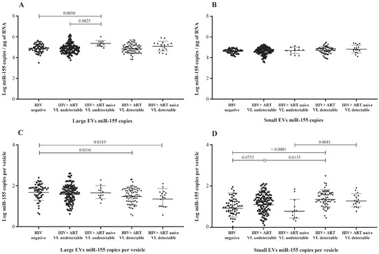 Previous studies have shown elevated levels of miR-155 in plasma, peripheral blood mononuclear cells, CD4 T and CD8 T cells, and EVs from HIV-1-infected patients [29,32,33,34]. Here, we compared its copy numbers in large and small plasma EVs purified from viremic and nonviremic HIV+ patients, as well as uninfected persons. Unlike miR-29a and miR-146a, miR-155 copies per µg of RNA were more abundant in large EVs from ART-naive nonviremic-infected patients, even compared to the ART-treated group (Figure 4A). Its expression in large and small vesicles does not appear to be proportionate to viremia (Figure S5A,B). Copies per large vesicle were decreased in viremic patients compared to control participants (Figure 4C and Figure S5C), whereas copies per small vesicles varied among the participant groups (Figure 4D) but were not proportionate to viremia (Figure S5D). These results nevertheless showed patterns of the differential expression of miR-155 in large and small EVs associated with viremia.