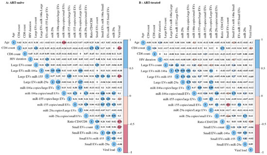Correlograms (Figure 5 and Figure S6) summarize the relationships between our measurements. MiR-155 copies per µg RNA or large EV were correlated significantly and inversely with viral load over 1000 copies per mL of ART-naive (Figure 5A and Figure S6B). In contrast, miR-29a and miR-146a copies in small EVs were positively correlated with the viral load in ART patients with over 1000 viral copies/mL (Figure S6C). An inverse correlation between age and miR-146a expression in small EVs was observed. As expected, the HIV-1 viral load was correlated inversely with the CD4 T-cell count and CD4/CD8 ratio (Figure 5). The number of small EVs was positively correlated with the CD4 T-cell count and negatively with the viral load in ART-naive patients (Figure 5A). Although the correlation between miRNA content and viral load appears to be strong, a significant discriminator between the viremic status groups remains identified.