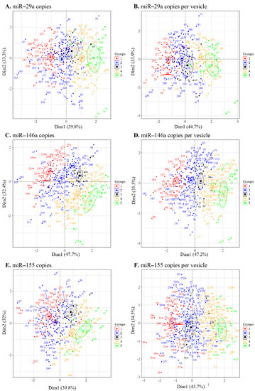 Given our correlogram results (Figure 5 and Figure S6) showing several correlations between the miRNA contents of large and small EVs and the clinical status, we used a principal component analysis to discriminate between the five patient groups (Figure 1A) based on miRNA copies per µg of the total RNA and copies per vesicle (Figure 6). The levels of miR-29a (Figure 6A,B), miR-146a (Figure 6C,D), and miR-155 (Figure 6E,F) each clearly distinguished between HIV- and viremic HIV+ individuals. The strength of this measurement is apparent in the confidence ellipses and the mean coordinates of the individuals in each group. Copies per vesicle seem to give a better graphical representation of the individuals, showing more excellent proximity of the viremic (ART-treated and ART-naïve) and nonviremic (ART-treated and ART-naive) group mean points. These results suggest that the quantitative measurement of EV-associated miR-29a, miR-146a, and miR-155 might be helpful for the diagnosis of individual viral statuses.