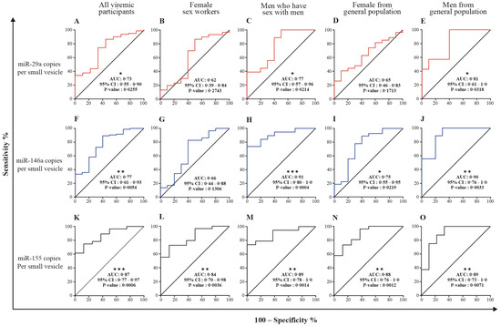 Small EV miRNA content diagnosis performances in the receiver operating characteristics curves analysis. MiRNA per small EVs was used to generate a receiver operator characteristic (ROC) curve analysis to discriminate viremic participants in different populations. The nonviremic patients ART-treated for more than six months and having a CD8 T cell count < 500 cells/µL, CD4 T cell count ≥ 500 cells/µL, and CD4/CD8 ≥ 1 (reference patient) as the controls. The diagnosis performance of miRNA expressed as copies per small vesicle for the discrimination of participants with detectable viral loads in all viremic participants were presented for miR-29a (A), miR-146a (F), and miR-155 (K). The diagnosis performance of miRNA expressed as copies per small vesicle for the discrimination of participants with detectable viral loads in female sex worker group participants were presented for miR-29a (B), miR-146a (G), and miR-155 (L). The diagnosis performance of miRNA expressed as copies per small vesicle for the discrimination of participants with detectable viral loads in men who have sex with men were presented for miR-29a (C), miR-146a (H), and miR-155 (M). The diagnosis performance of miRNA expressed as copies per small vesicle for the discrimination of participants with detectable viral loads in female from general population group were presented for miR-29a (D), miR-146a (I), and miR-155 (N). The diagnosis performance of miRNA expressed as copies per small vesicle for the discrimination of participants with detectable viral loads in men from general population group were presented for miR-29a (E), miR-146a (J), and miR-155 (O). Wilson/Brown method was used to compute the area under a ROC curve.