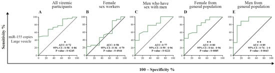 Large EV miR-155 content diagnosis performance in the receiver operating characteristics curves analysis. MiR-155 per large EVs was used to generate a receiver operator characteristic (ROC) curve analysis to discriminate viremic participants in different populations. The nonviremic patients ART-treated for more than six months and having a CD8 T cell count < 500 cells/µL, CD4 T cell count ≥ 500 cells/µL, and CD4/CD8 ≥ 1 (reference patient) undetectable viral load under ART were used as controls. Wilson/Brown method was used to compute the area under a ROC curve. The diagnosis performance of miR-155 copies per µg of total RNA in large for the discrimination of participants with detectable viral were presented for all participants (A), female sex workers (B), men who have sex with men (C), female from general population (D), and men from general population (E). Wilson/Brown method was used to compute the area under a ROC curve.