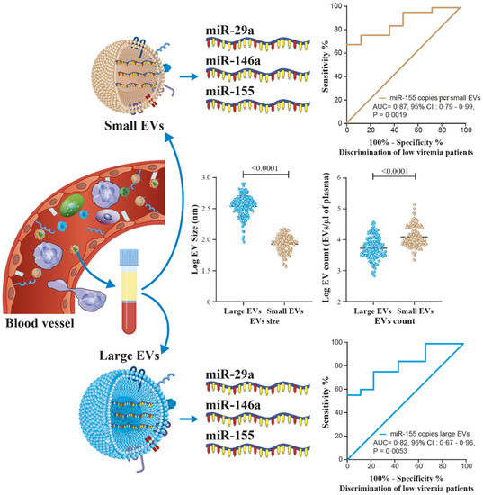 The release of EVs bearing miRNA reportedly regulates the intracellular miRNA levels directly, and EVs may play a role in cell disposal, since they also contain intracellular components that suggest their other use as garbage bags [34,35]. Significant differences in the content of large versus small plasma EVs from HIV+ subjects confirm observations that HIV infection alters the profile of microRNA expression. Our study is one of the first to compare the expression of miR-29a, miR-146a, and miR-155 in viremic and nonviremic patients in association with large and small plasma EVs. We found that miR-29a is overexpressed in small EVs of viremic patients and that its expression per small EV is the best discriminator of ART-treated patients with low viremia. We also found that miR-146a is overexpressed in large and small plasma EVs of persons with detectable viremia. The expression of miR-155 in copies per vesicle appears to be elevated in small EVs and reduced in large EVs in viremic compared to nonviremic patients. Moreover, this expression was the best discriminator of viremic patients.