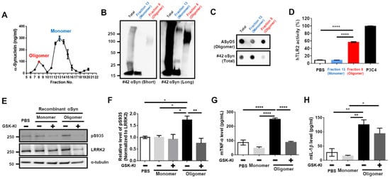 LRRK2 inhibitor mitigated LRRK2 activity and reduced mTNFα level that was upregulated by the TLR2-specific αSyn oligomer. (A) After separation of incubated αSyn pool using FPLC, the concentration of αSyn was assessed in each gel filtration fractions using sandwich ELISA. The oligomer (number 8, indicated with red-letter) and monomer (number 13, indicated with the blue letter) fractions were collected. Oligomer and monomer fractions and pre-injection mixture (Total) were subjected to Western blot (B) and dot-blot (C) analyses. (D) The human Toll-like receptor2 (hTLR2) activity induced by oligomer and monomer fractions was tested. PBS was used as the negative control, and P3C4 was considered as positive control. (E,F) After treating the cells with monomeric or oligomeric αSyn with or without the treatment with 1 μg/mL GSK-KI (LRRK2 kinase inhibitor, GSK2572815A) for 18 h, the cell lysates were analyzed using Western blotting. The levels of mTNFα (G) and mouse interleukin-1β (mIL-1β) (H) released were measured from (E). n = 4. * p < 0.05, ** p < 0.01, and **** p < 0.0001. All data are represented as the mean ± SEM.
