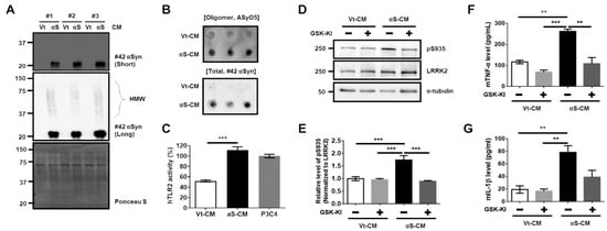 LRRK2 inhibitor hinders the LRRK2 activity and mTNFα release via the release of TLR2-specific αSyn from differentiated SH-SY5Y (dSH). The analyses of conditioned media of vector -transfected dSH (Vt-CM) and Flag-αSyn-transfected (αS-CM) using Western blotting (A) or dot-blot analysis (B) revealed an oligomeric formation of αSyn in αS-CM. The high molecular weight Flag-αSyn oligomer (HMW) band is indicated by the open curly bracket. # indicates a number of n. (C) The hTLR2 activity was higher in the treated αS-CM than in the treated Vt-CM. (D,E) The effect of the treatment of Vt-CM and αS-CM with or without GSK-KI for 18 h on BV2 was analyzed using Western blotting. The released levels of mTNFα (F) and mIL-1β (G) in the media were measured from (D). n = 3. ** p < 0.01 and *** p < 0.001. All data are represented as the mean ± SEM.
