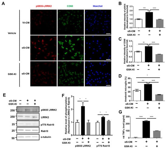 LRRK2 inhibitor ameliorated αSyn-induced neuroinflammation in rat primary microglia. (A–C) Immunostaining of pS935 and CD68, as markers of microglial activation, was assessed using their fluorescence intensities, and the microglia with ameboid morphology were counted (D). n = 3, approximately 30–60 cells for IF. (E,F) The change in LRRK2 activity induced by the treatment of αS-CM with or without GSK-KI was analyzed using Western blotting, and the released levels of rat TNFα from (E) were determined using ELISA (G). n = 3. * p < 0.05, ** p < 0.01, *** p < 0.001, and **** p < 0.0001. All data are represented as the mean ± SEM.