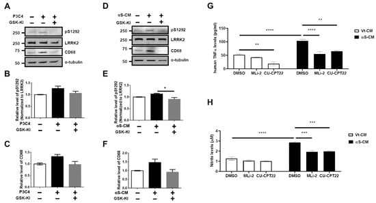 LRRK2 inhibitor decreased TLR2-mediated neuroinflammatory responses in human microglial cells. Western blot analysis of P3C4 treated with or without GSK-KI (A) helped assess the phosphorylation levels at S1292 in LRRK2 (B) and CD68 (C). Cell lysates obtained from the treatment of αS-CM with or without GSK-KI were subjected to Western blot analysis (D), and the levels of S1292 phosphorylation in LRRK2 (E) and CD68 (F) were estimated from the densitometric analysis of the immunoblots. n = 3. The released levels of human TNFα (G) and nitrite (H) were assessed from the culture media of C20 incubated with Vt-CM or αS-CM that was treated with DMSO (vehicle), MLi-2 (0.5 μM), or CU-CPT22 (10 μM) for 18 h. n = 4. * p < 0.05, ** p < 0.01, *** p < 0.001, and **** p < 0.0001. All data are represented as the mean ± SEM.