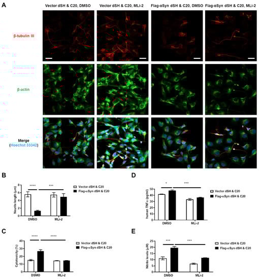 LRRK2 inhibitor alleviated the dopaminergic neuronal degeneration caused by neuroinflammatory responses, which are mediated by the dopaminergic neuron-released αSyn. (A,B) The neurite length of dSH was measured using the NeuronJ application in ImageJ program. Green: β-actin, Red: β-tubulin III, Blue: Hoechst 33342; approximately 21–23 cells for IF, n = 3. The measurement of LDH activity (C), hTNFα (D), and nitrite (E) in the culture media of (A) were analyzed. n = 3. * p < 0.05, *** p < 0.001, and **** p < 0.0001. All data are represented as the mean ± SEM.