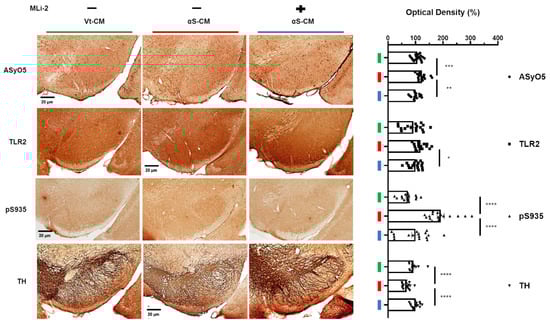 We observed that Vt-CM injection did not change the mobility of mice throughout the experiments, and αS-CM injection with vehicle administration significantly decreased the mobility of mice. However, administration of the LRRK2 inhibitor after αS-CM injection no longer worsened the mobility of mice (Figure 6B,C). In addition, the significant increase in the number of reactive microglia in the SN following the injection of αS-CM was moderately mitigated by the administration of LRRK2 kinase inhibitor (Figure 6D). Simultaneously, αS-CM injection with the administration of the vehicle elevated the optical densities of oligomeric αSyn and TLR2, phosphorylation of LRRK2, and TH in the SN (Figure 7).