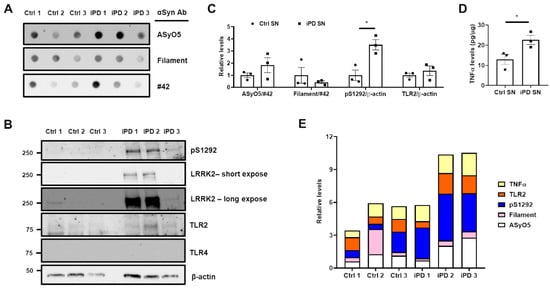 Despite the similarity in the levels of TLR2, which were normalized to β-actin (Figure 8B,C), the TNFα levels in the iPD SN were higher than those in the Ctrl SN (Figure 8D). When these variables were compared at the individual level (Figure 8E), we found that higher levels of ASyO5-positive αSyn oligomers were related to higher pS1292, TLR2, and TNFα levels in iPD 2 and iPD 3. However, pS1292 in iPD 1 was not related to the elevation of TLR2 or TNFα levels, and the increase in filament αSyn oligomer was not responsible for TLR2 induction or LRRK2 kinase activity in Ctrl 2. Unfortunately, we could not observe TLR4 expression in either the Ctrl SN or iPD SN (Figure 8B). Further studies on SN lysates from patients is required owing to an insufficiency of samples in the current study. Nevertheless, we concluded that TLR2-specific αSyn oligomers upregulated LRRK2 kinase activity and elevated TNFα levels.