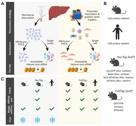 - Roh, H.C.; Tsai, L.T.-Y.; Lyubetskaya, A.; Tenen, D.; Kumari, M.; Rosen, E.D. Simultaneous Transcriptional and Epigenomic Profiling from Specific Cell Types within Heterogeneous Tissues In Vivo. Cell Rep. 2017, 18, 1048–1061. [Google Scholar] [CrossRef] [PubMed]