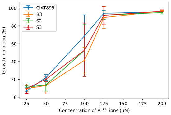 Growth in Al-containing media was compared for three rhizobia strains from Western Kenya (S3 and two previously isolated R. phaseoli strains B3 and S2) [31] and the commercial strain CIAT899. Al inhibited the growth of all four strains already at 25 µM (~10%), and above 125 µM Al, growth of the four bacteria was inhibited by >90% (Figure 1). Between these two extremes, the three isolates B3, S2, and S3 grew better than the commercial strain CIAT899, and in all Al concentrations, B3 showed the best growth among the three Kenyan isolates. In particular, in media with 100 µM Al, B3 grew almost twice as well as the commercial strain CIAT899, although the percentage growth was not significantly different. Therefore, this strain was investigated in more detail. Figure 1 demonstrates that the new strains are better adapted to the conditions of the Kenyan soil than the commercial strain CIAT899.