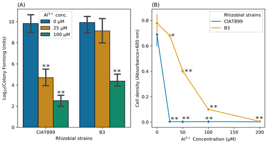 Cell viability approximated by plate count of viable cells after short-time exposure (A) and viability recovery after longtime exposure (B) of isolates B3 and CIAT899 to different Al concentrations. Asterisks represent significance differences between Al-treated CIAT899 and B3 and their respective untreated controls (at 0 µM Al) (one-way ANOVA; * p ≤ 0.05; ** p ≤ 0.001).