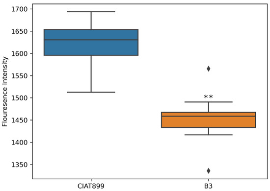 Calcein exclusively binds to Al in the pH range between 5 and 6 to generate a fluorescence complex that can be visualized by fluorescence microscopy or quantified with a fluorescence plate reader. Unlike calcein-AM, Calcein does not enter the living cells; thus, it can label extracellular Al bound to the cell membrane. The fluorescence signal produced by CIAT899 was significantly higher than that of B3 (Figure 3). This indicates that more Al is bound to CIAT889 than B3 membranes.