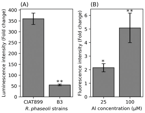 Extracellular ATP (A) and extracellular mScarlet-1 (B). Asterisks represent significance differences between luminescence intensity from CIAT899 and B3 (A) and fluorescence intensity between untreated B3 cells with Al-treated cells at various concentrations (one-way ANOVA; * p ≤ 0.05; ** p ≤ 0.001). Values on the y-axis show fold change compared to the untreated cells.