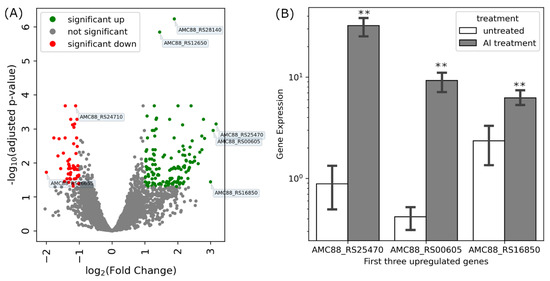 Gene expression analysis of Al-treated B3 cells compared to untreated control cells. A volcano plot (A) shows significantly different (colored) or not significantly different (grey) up-and down-regulated genes in Al-treated cells. (B) Quantitative real-time PCR of the three upregulated genes, highlighted in panel (A). Asterisks in (B) represent significant differences in transcript abundance between Al treated samples and untreated controls (one-way ANOVA; ** p ≤ 0.001).